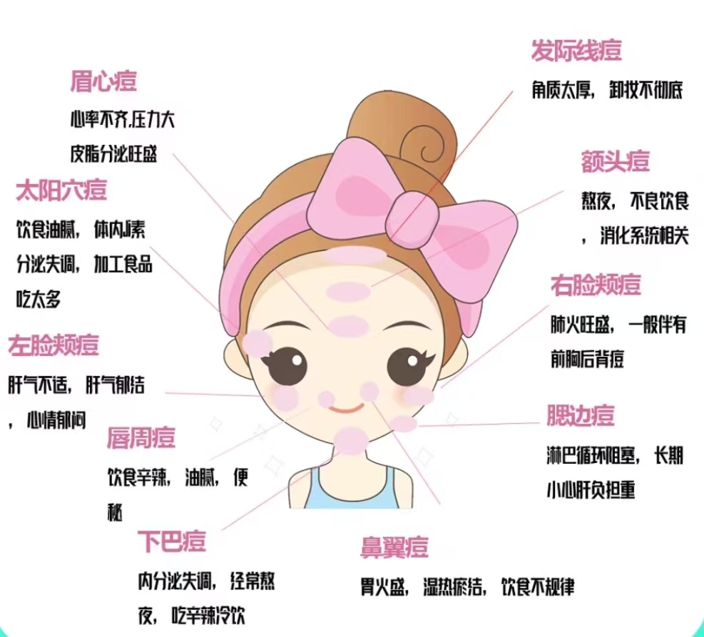 来聊聊一个大家都非常关心的话题——痘痘!你有没有发现,脸上的痘痘长在不同的位置,原因其实大不相同?快来看看吧!